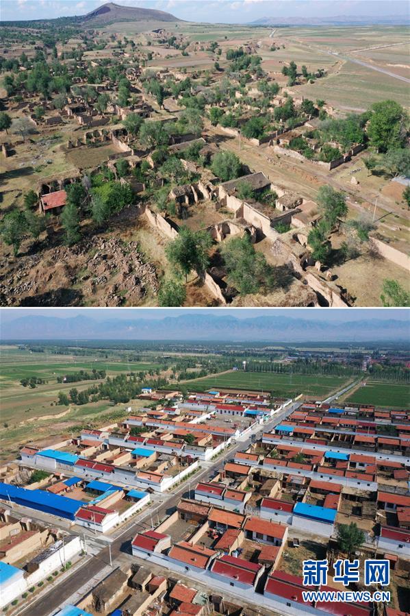 拼版照片:上圖為東坪村舊村村貌;下圖為東坪村新村村貌(6月13日無人機拍攝)。
