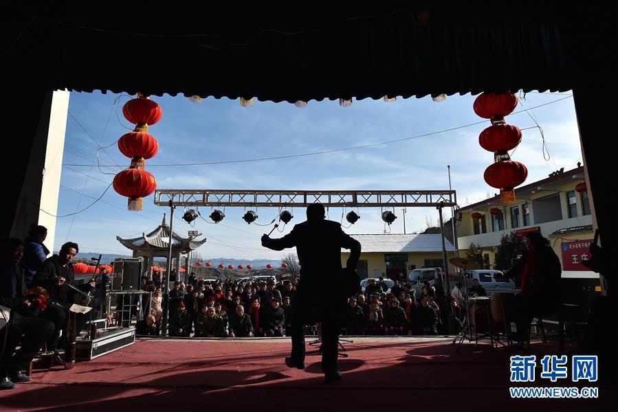 在武鄉(xiāng)縣大有鄉(xiāng)王莊溝村,村里請(qǐng)來(lái)的劇團(tuán)在文化劇場(chǎng)為村民演出(2月16日攝)。新華社記者 詹彥 攝