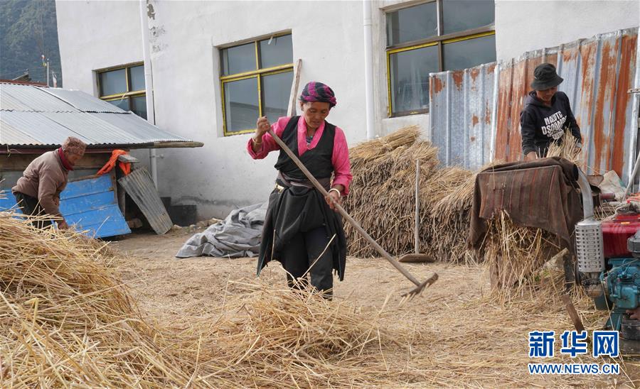 乃村村民抓緊好天氣打場收糧(8月26日攝)。 新華社記者 多吉占堆 攝