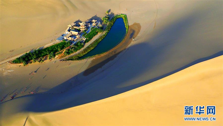 位于敦煌市鳴沙山北麓的月牙泉(2016年9月9日無人機拍攝)。新華社記者 陳斌 攝