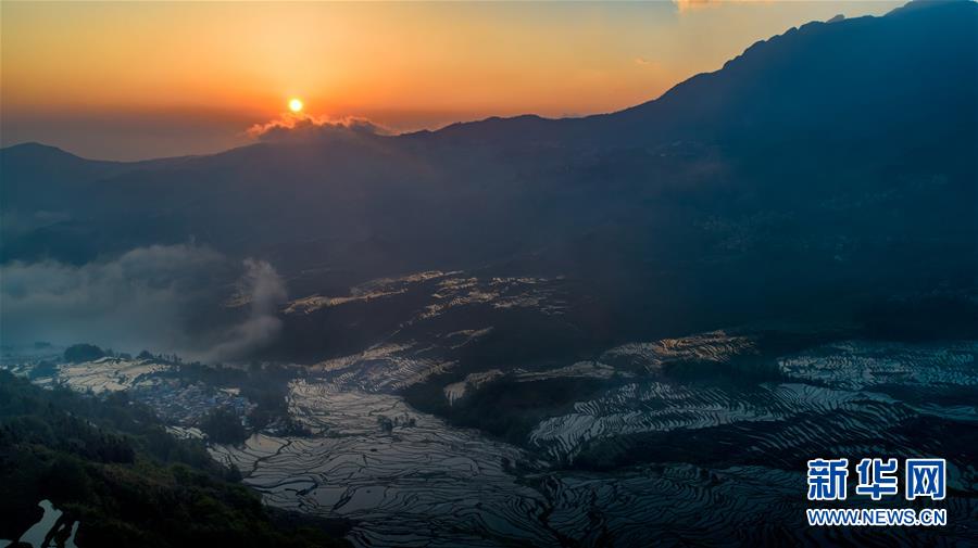 在云南省元陽縣拍攝的晨曦中的哈尼梯田(4月4日無人機拍攝)。  新華社記者胡超攝