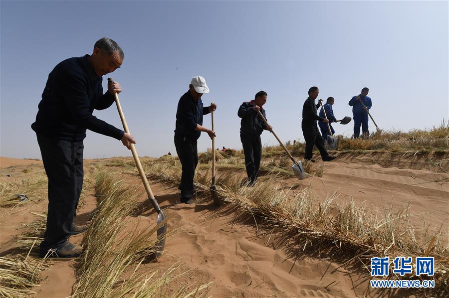 在甘肅省古浪縣境內(nèi)的黑崗沙風沙口,八步沙第二代治沙人用稻草壓沙(3月26日攝)。新華社記者 范培珅 攝