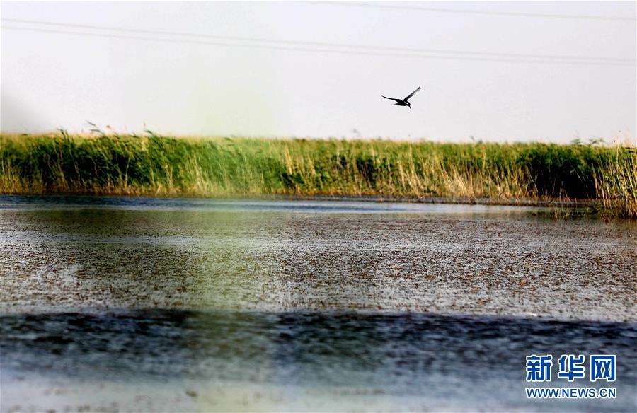 一只候鳥在青土湖水面飛翔(6月13日攝)。位于巴丹吉林沙漠和騰格里沙漠夾縫中的青土湖,是甘肅省武威市民勤縣的“沙漠之湖”,也是當?shù)厣鷳B(tài)變遷的“晴雨表”。新華社記者 郭剛 攝
