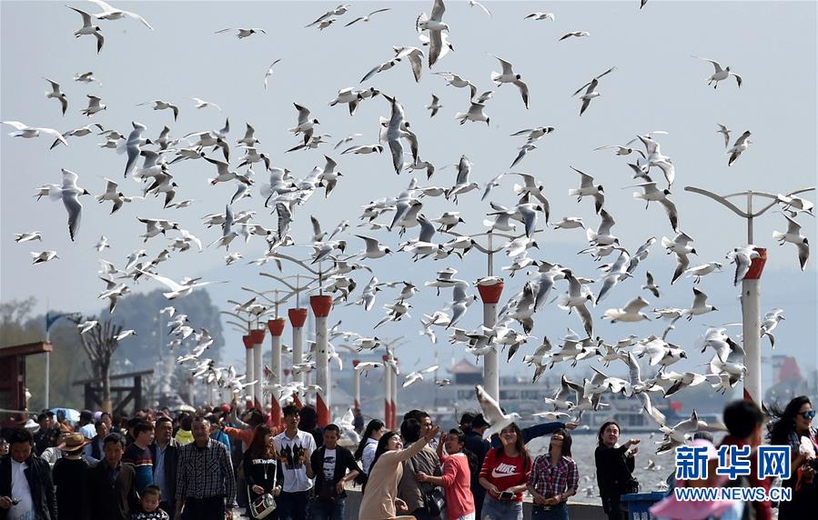 人們在昆明滇池邊與紅嘴鷗嬉戲(2016年3月15日攝)。  新華社記者 藺以光 攝