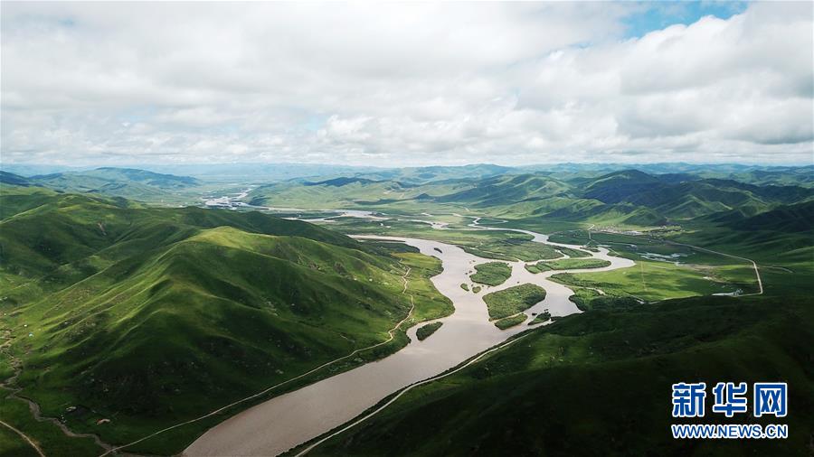 黃河流經(jīng)的甘肅省甘南藏族自治州瑪曲縣境內(nèi)濕地和草原(6月23日無(wú)人機(jī)拍攝)。新華社記者 陳斌 攝