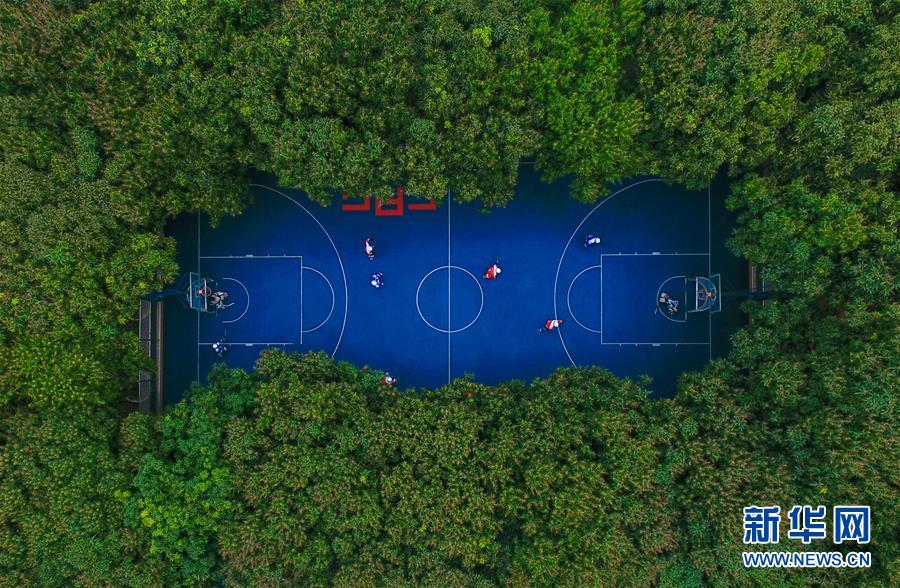 這是被綠蔭環(huán)繞的廣州第四十一中學運動場(2017年3月16日無人機拍攝)。 新華社記者 劉大偉 攝