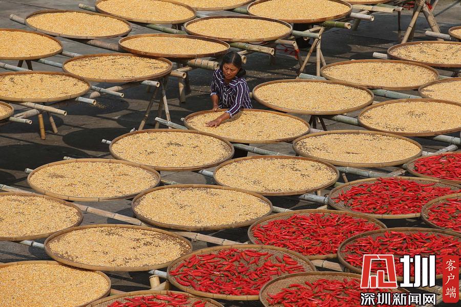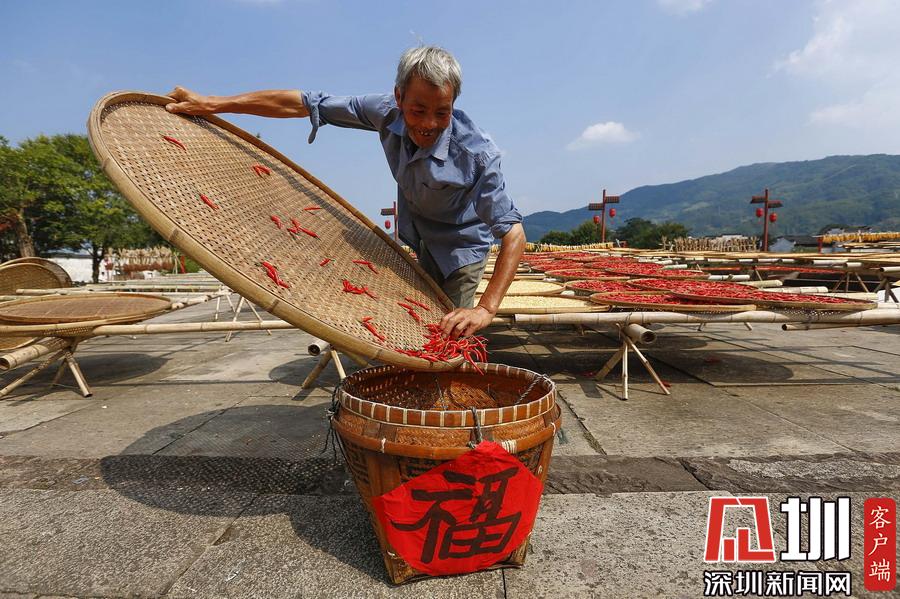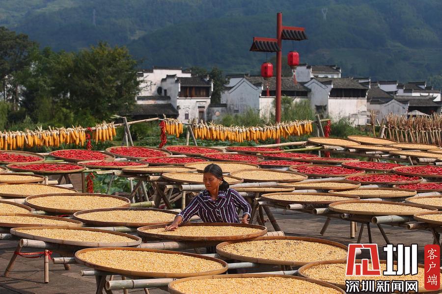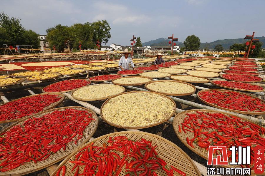 當日立秋節(jié)氣,江西婺源縣篁嶺古村的農(nóng)作物普遍豐收,村民們又迎來了一年一度的“曬秋”季。