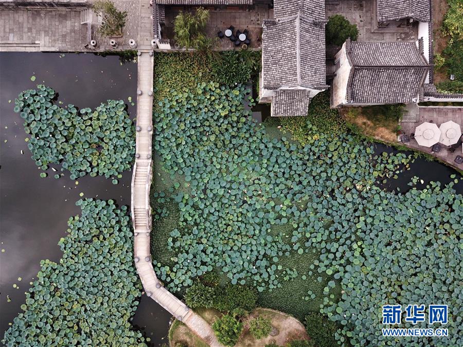 這是無人機拍攝的呈坎村內(nèi)的荷塘(8月28日攝)。新華社記者劉軍喜攝