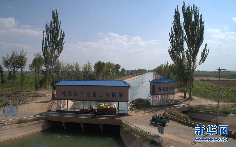 9月4日無(wú)人機(jī)拍攝的河套灌區(qū)楊家河干渠第二節(jié)制閘。 新華社記者 劉詩(shī)平 攝