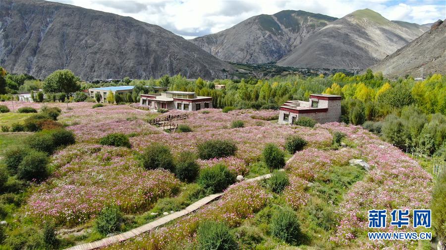 9月13日無人機拍攝的尼木縣山谷間盛開的波斯菊。 新華社記者 晉美多吉 攝