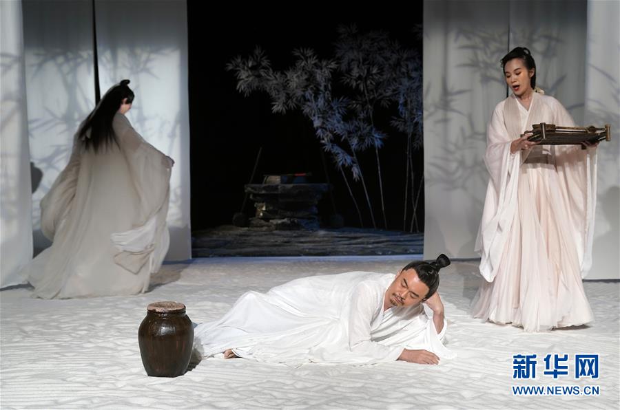 9月16日,演員在話(huà)劇《廣陵絕》中表演。 當(dāng)日,話(huà)劇《廣陵絕》在北京人藝實(shí)驗(yàn)劇場(chǎng)上演。新華社記者 金良快 攝