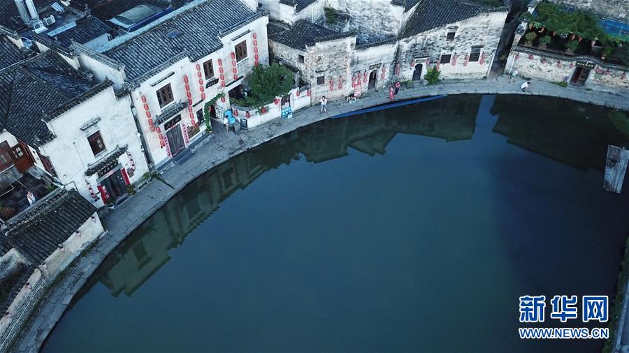 這是8月4日無人機拍攝的安徽黟縣宏村風(fēng)景區(qū)月沼晨景。新華社記者張端攝