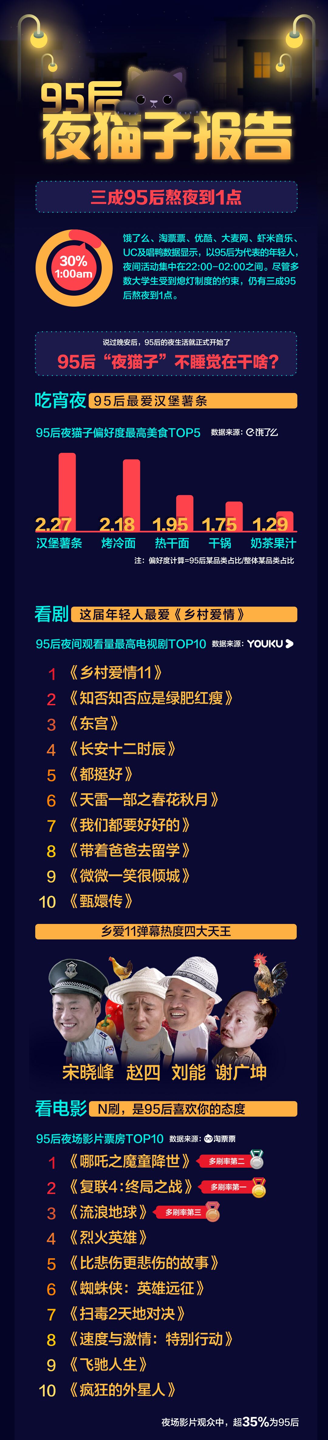“沒(méi)有什么是一頓宵夜解決不了的。如果有,那就兩頓?!别I了么數(shù)據(jù)顯示,95后年輕人最愛的宵夜品類是漢堡薯?xiàng)l、烤冷面、熱干面等。養(yǎng)生黨避之不及的“高熱量”似乎并沒(méi)有影響95后夜貓子的宵夜選擇。