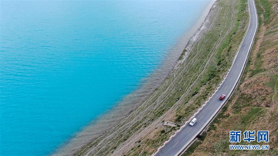 8月31日無(wú)人機(jī)拍攝的羊卓雍錯(cuò)及邊上的307省道。新華社記者晉美多吉攝