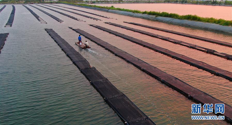 郭旗和愛(ài)人坐船查看海參養(yǎng)殖情況(9月5日無(wú)人機(jī)拍攝)。 新華社記者 楊青 攝
