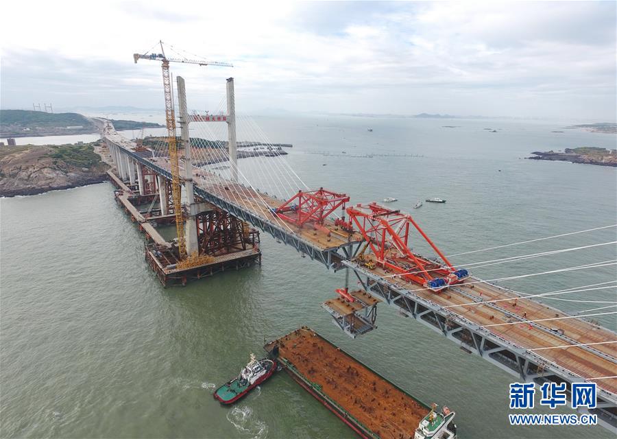 9月21日,平潭海峽公鐵大橋鼓嶼門航道橋的鋼桁梁在吊裝中(無(wú)人機(jī)拍攝)。9月25日上午,隨著一段長(zhǎng)17米、重473噸的鋼桁梁被精確固定到位,總長(zhǎng)16.34公里的平潭海峽公鐵大橋合龍貫通。平潭海峽公鐵大橋是福州至平潭鐵路控制性工程,也是“十三五”規(guī)劃中北京至臺(tái)灣高鐵的先期工程。大橋起于福州市長(zhǎng)樂區(qū),“踏”過(guò)四座小島后抵達(dá)中國(guó)第五大島平潭,上層設(shè)計(jì)為時(shí)速100公里的六車道高速公路,下層為設(shè)計(jì)時(shí)速200公里的高鐵。據(jù)福建福平鐵路公司介紹,大橋計(jì)劃2020年正式通車。在六年建設(shè)過(guò)程中,平潭海峽公鐵大橋所應(yīng)用研發(fā)的多項(xiàng)技術(shù)、裝備創(chuàng)下國(guó)內(nèi)外紀(jì)錄。新華社記者林善傳攝