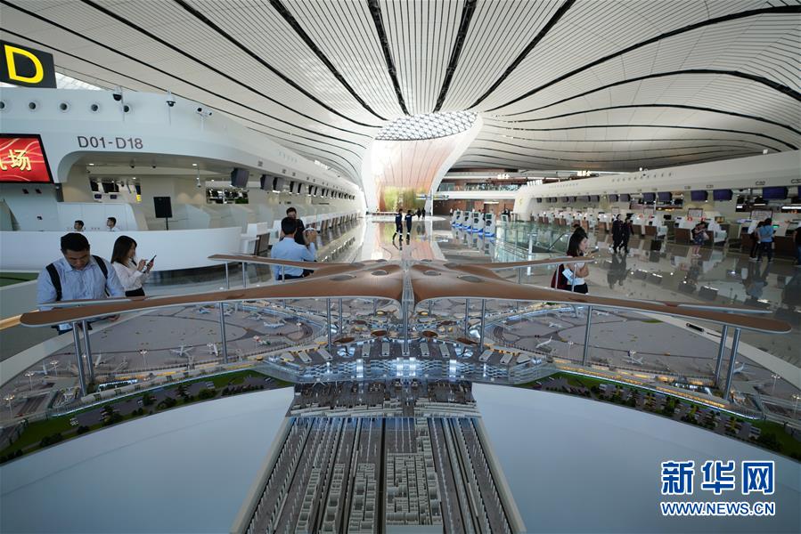 9月25日拍攝的在北京大興國際機(jī)場航站樓內(nèi)擺放的機(jī)場航站樓模型。新華社記者鞠煥宗攝