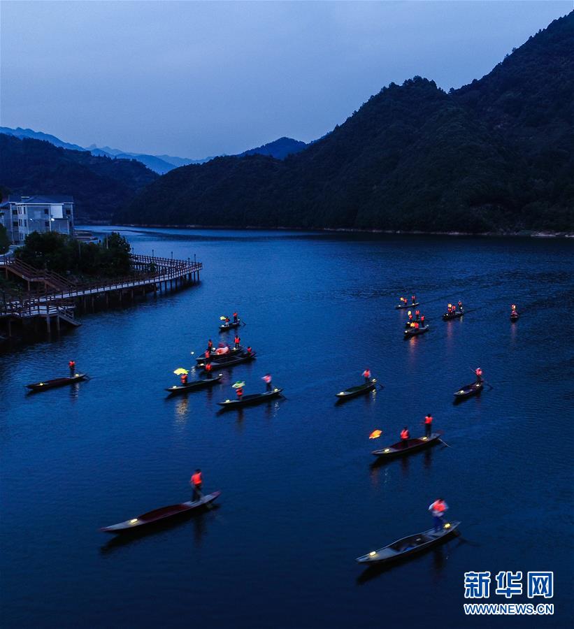 9月25日,在宋村鄉(xiāng)云源港的水面上,漁民劃著漁船,船頭點(diǎn)亮漁燈,構(gòu)成一幅“漁舟唱晚、萬家燈火”的美麗圖景(無人機(jī)拍攝)。 新華社記者 徐昱 攝