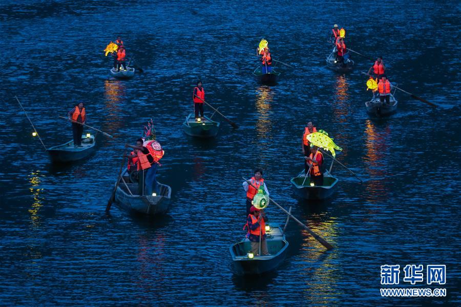 9月25日,在宋村鄉(xiāng)云源港的水面上,漁民劃著漁船,船頭點亮漁燈,構(gòu)成一幅“漁舟唱晚、萬家燈火”的美麗圖景。 新華社記者 徐昱 攝