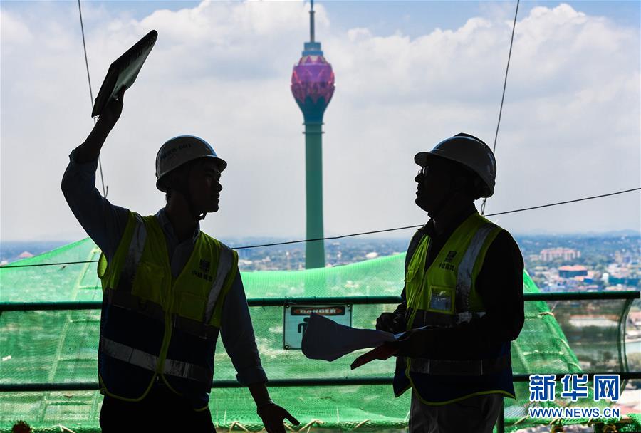 2019年4月9日,在斯里蘭卡科倫坡,中方項目經(jīng)理楊子江(左)與項目副經(jīng)理Thuwan在工地討論工作進度,他們背后是科倫坡地標建筑蓮花塔。Thuwan是中國中建裝飾集團深圳裝飾公司斯里蘭卡濱江度假村項目的副經(jīng)理。在中方管理人員手把手的指導下,Thuwan從最初的一名普通商務(wù)員變成了一位優(yōu)秀的屬地化管理人員,成為了中斯雙方人員溝通的橋梁。新華社記者劉大偉攝