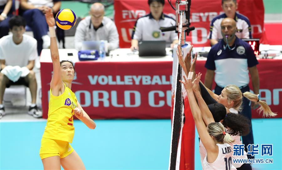 9月23日,中國隊球員朱婷(左)在比賽中扣球。當(dāng)日,在日本札幌舉行的2019年女排世界杯賽第二階段A組循環(huán)賽中,中國隊以3比0戰(zhàn)勝美國隊。新華社記者杜瀟逸攝