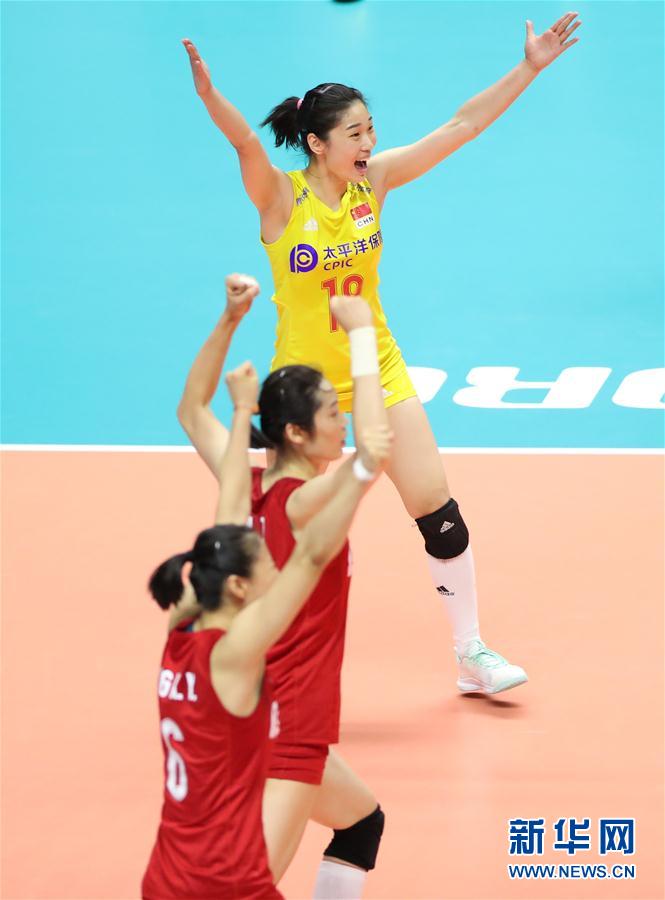 9月22日,中國(guó)隊(duì)球員在比賽后慶祝勝利。當(dāng)日,在日本札幌舉行的2019年女排世界杯賽第二階段A組循環(huán)賽比賽中,中國(guó)隊(duì)以3比2戰(zhàn)勝巴西隊(duì)。新華社記者杜瀟逸攝