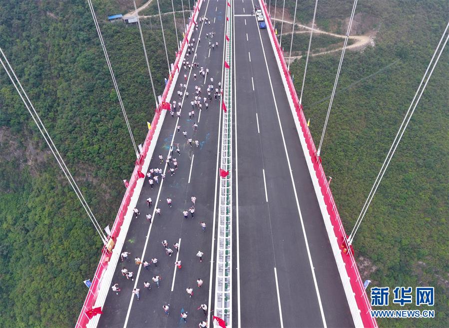 9月30日,赤水河大橋建設(shè)者以一場(chǎng)彩虹跑慶祝大橋建成(無(wú)人機(jī)攝)。新華社記者劉坤攝