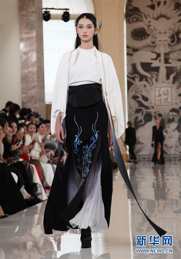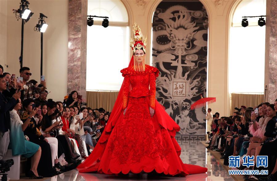9月30日,在法國巴黎,模特展示中國高級女裝品牌“蓋婭傳說·熊英”2020春夏新品。新華社記者 唐霽 攝