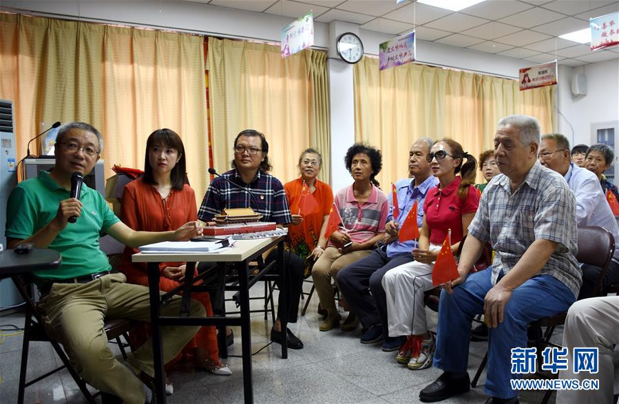 10月1日,在天津市和平區(qū)昆明路社區(qū)黨群服務(wù)中心,天津“心目影院”創(chuàng)始人鄭偉(左一)和兩位講解員在為視障人士“直播”慶祝中華人民共和國成立70周年大會(huì)的盛況。當(dāng)日是國慶節(jié),全國各地的人們用各種方式歡度節(jié)日。新華社記者 宋瑞 攝