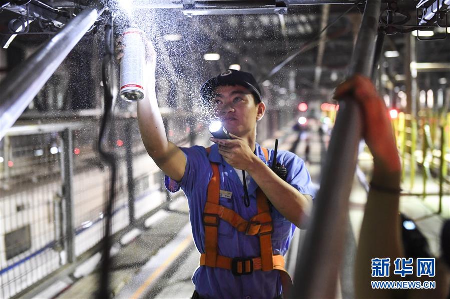 “動車醫(yī)生”用檢漏劑對受電弓升弓氣囊進(jìn)行檢查(10月2日攝)。 新華社記者 曹祎銘 攝