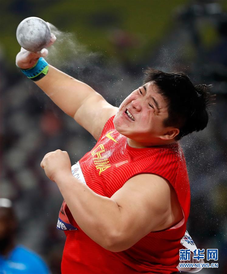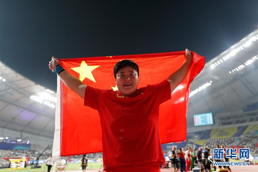 當日,在卡塔爾多哈舉行的2019國際田聯(lián)世界田徑錦標賽女子鉛球決賽中,衛(wèi)冕冠軍、中國選手鞏立姣以19米55的成績奪得冠軍。 新華社記者賈宇辰攝