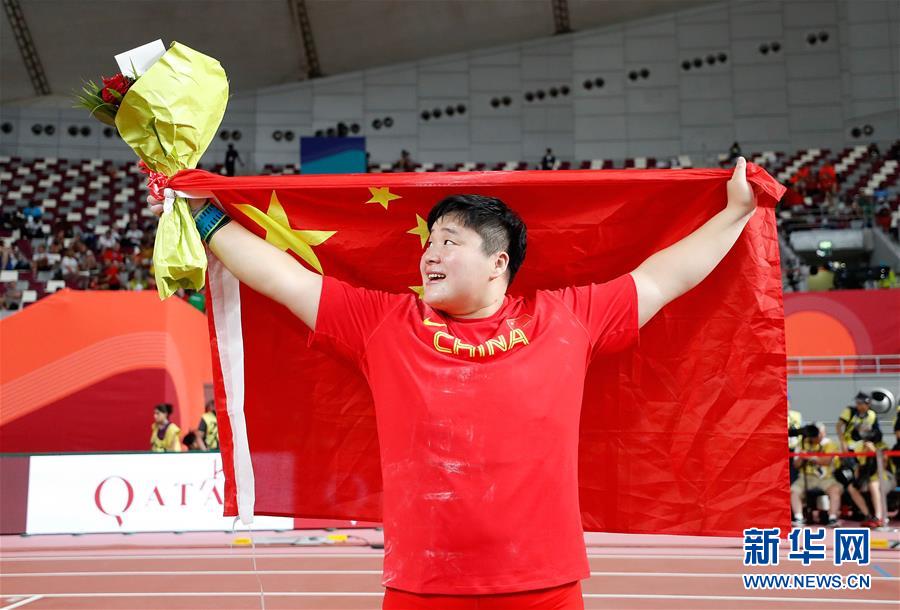 當日,在卡塔爾多哈舉行的2019國際田聯(lián)世界田徑錦標賽女子鉛球決賽中,衛(wèi)冕冠軍、中國選手鞏立姣以19米55的成績奪得冠軍。 新華社記者李鋼攝