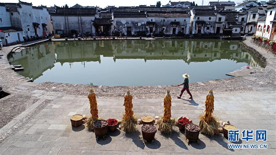 10月5日,新葉古村內(nèi)的“曬秋”美景(無人機(jī)拍攝)。新華社記者徐昱攝
