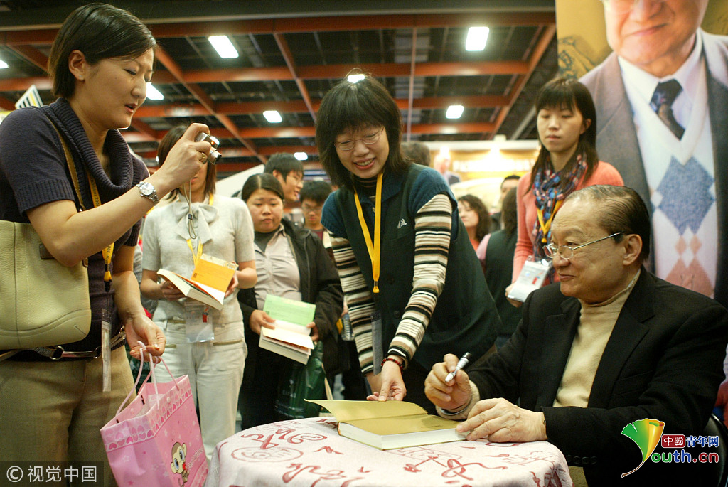 2007年2月2日上午,臺(tái)灣,武俠小說大師金庸現(xiàn)身臺(tái)北國(guó)際書展為書迷簽名,許多讀者除了拿小說來簽名外,還帶著相機(jī)來拍照。圖片作者:聯(lián)合知識(shí)庫(kù)
