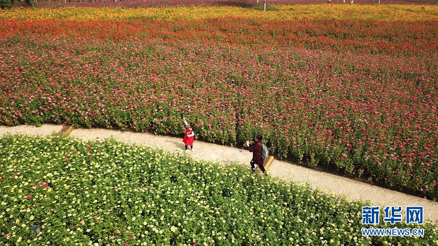 10月9日,小朋友和家長在四季花海城市公園游玩(無人機(jī)拍攝)。 秋日時節(jié),位于安徽省合肥市的四季花海城市公園花香四溢,色彩繽紛,成為游客和市民休閑游玩的好去處。 新華社記者 張端 攝