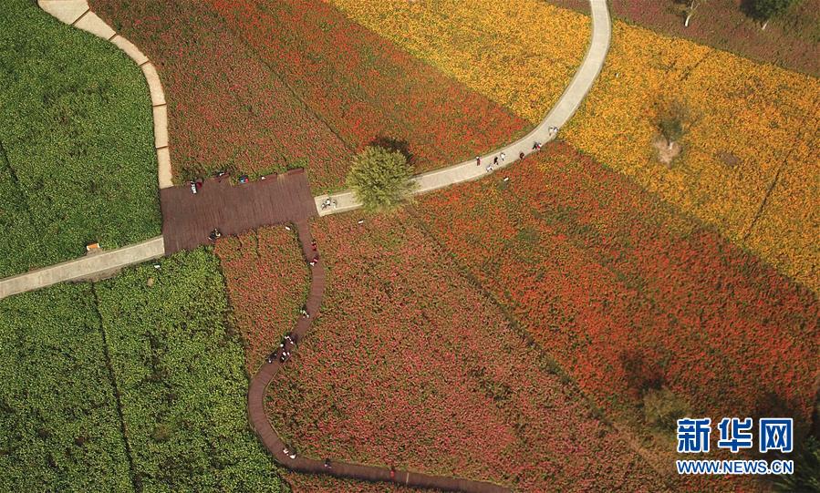 10月9日無人機拍攝的四季花海城市公園風景。 秋日時節(jié),位于安徽省合肥市的四季花海城市公園花香四溢,色彩繽紛,成為游客和市民休閑游玩的好去處。 新華社記者 張端 攝