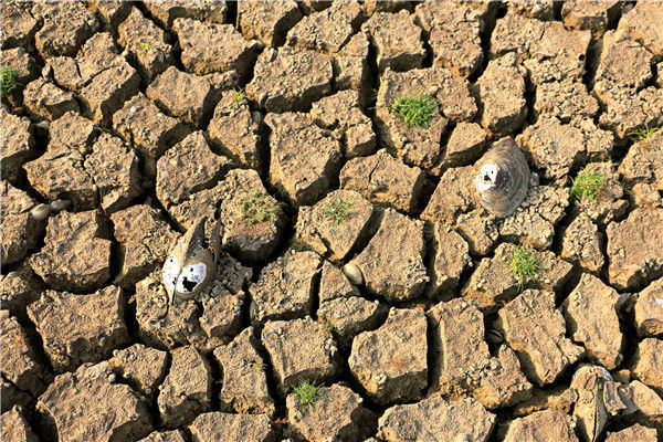 當(dāng)?shù)貢r(shí)間2016年5月13日,柬埔寨甘丹省,受厄爾尼諾現(xiàn)象影響,當(dāng)?shù)卦庥龈珊堤鞖?,池塘干涸開(kāi)裂。