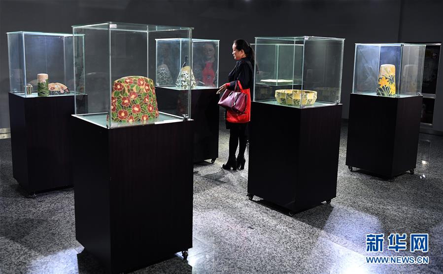 參觀者在江西景德鎮(zhèn)美術(shù)館參觀“笠間燒”日本陶藝家的作品展(2018年10月19日攝)。新華社記者 萬(wàn)象 攝