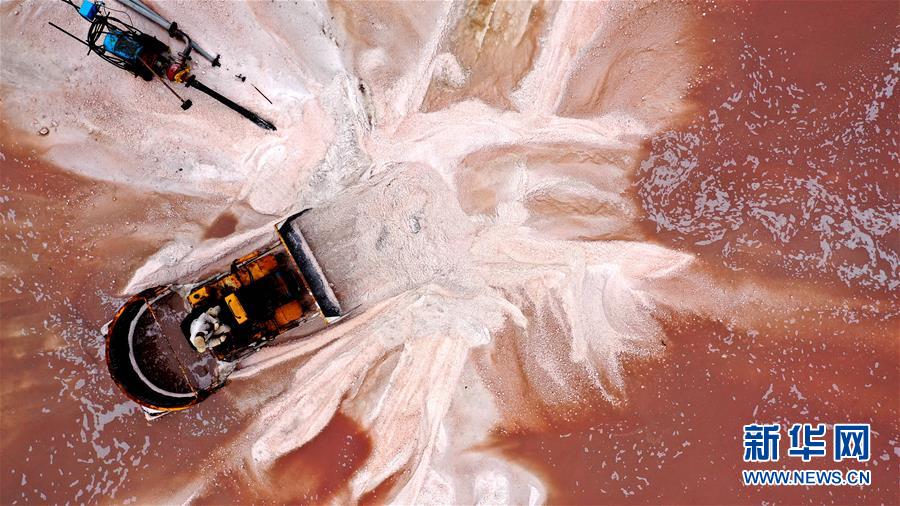 魯北鹽場(chǎng)工人在鹽池中收獲海鹽(10月9日無人機(jī)拍攝)。新華社記者 朱崢 攝