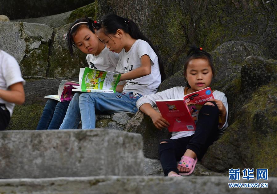 黔桂烏英苗寨的孩子們在閱讀剛剛獲贈的圖書(10月11日攝)。