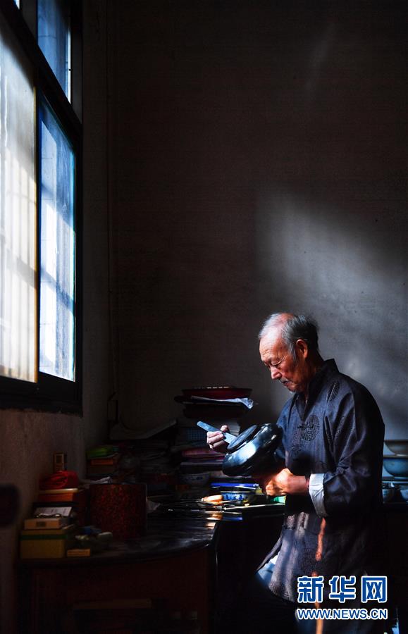 10月12日,丁國坤在家中為一件未成形的脫胎漆器進(jìn)行“上漆”工序。