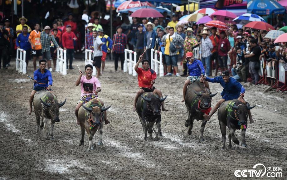 央視網消息:當?shù)貢r間2019年10月12日,泰國春武里舉行一年一度的水牛賽跑,選手騎牛狂奔。視覺中國