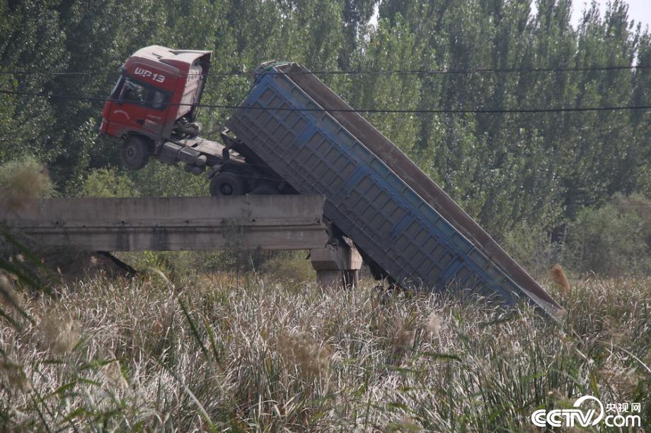 2019年10月13日,山東濱州,一輛滿載貨物的大貨車路過(guò)當(dāng)?shù)匾蛔鶎?米左右的小橋時(shí),致使橋面坍塌。據(jù)報(bào)道,13日凌晨4點(diǎn)左右,一輛重型半掛貨車沿渤海十八路由南向北行駛至市西辦事處李茂家村附近,右轉(zhuǎn)彎進(jìn)入連接渤海十八路與李茂家村村西鄉(xiāng)間路的一座寬4米左右的小橋時(shí),致使橋面坍塌?,F(xiàn)場(chǎng)貨車呈翹起之勢(shì),車頭懸于半空中,車尾插入水中,事故未造成人員傷亡。據(jù)現(xiàn)場(chǎng)了解,該橋建設(shè)于1974年,橋頭有警示標(biāo)識(shí),警示承載4噸。目前救援工作正在緊張有序地進(jìn)行中。視覺中國(guó)