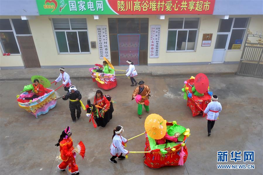 在奪火鄉(xiāng)高谷堆村,村民在排練傳統(tǒng)民俗節(jié)目“推小車(chē)”(10月14日攝)。 新華社記者 曹陽(yáng) 攝