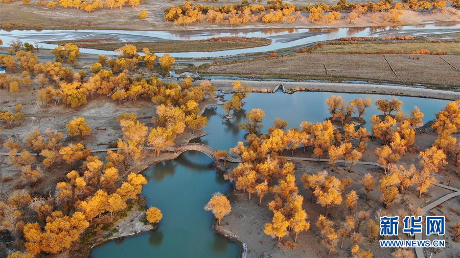 10月16日無人機(jī)拍攝的內(nèi)蒙古阿拉善盟額濟(jì)納旗境內(nèi)的胡楊林。新華社記者彭源攝