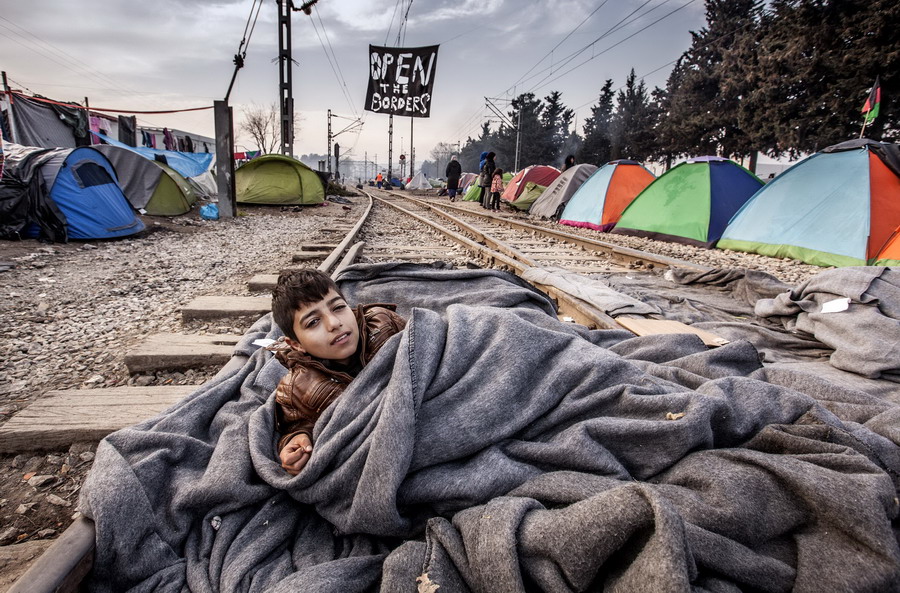 當?shù)貢r間2016年3月22日,希臘伊多梅尼,來自敘利亞阿勒頗的難民男孩躺在鐵軌上睡覺。