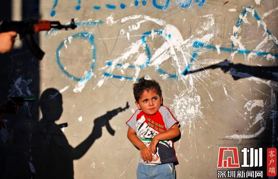 當(dāng)?shù)貢r(shí)間2009年6月16日,約旦河西岸拉馬拉,Al-Amari難民營里,一個(gè)巴勒斯坦小男孩面對朝他舉著玩具槍的少年露出驚恐的表情。