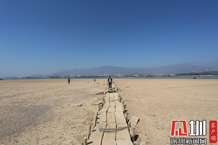 2019年10月20日,江西九江,鄱陽湖星子站水位為10.18米,隨著水位持續(xù)下降,豐水期浸泡在鄱陽湖底的一座總長(zhǎng)2930米被譽(yù)為“中國最長(zhǎng)的湖中古木石橋”露出水面。