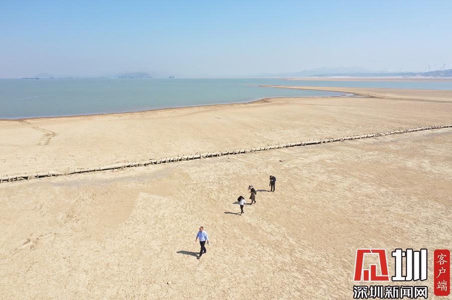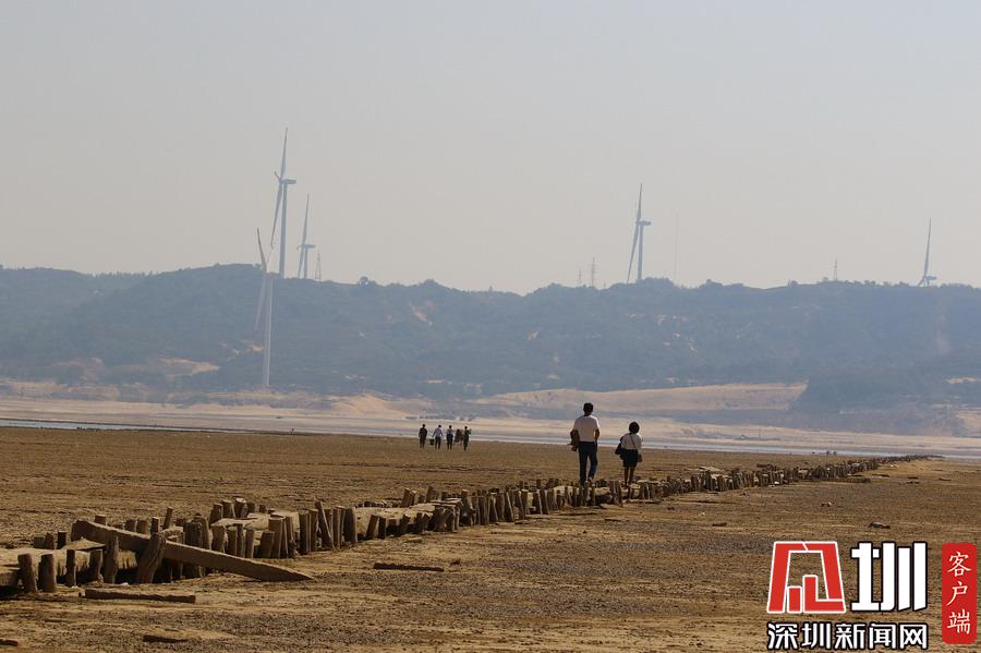 10月9日,江西省廬山市,游客行走在鄱陽湖湖區(qū)干涸的湖面上。新華社記者胡晨歡攝