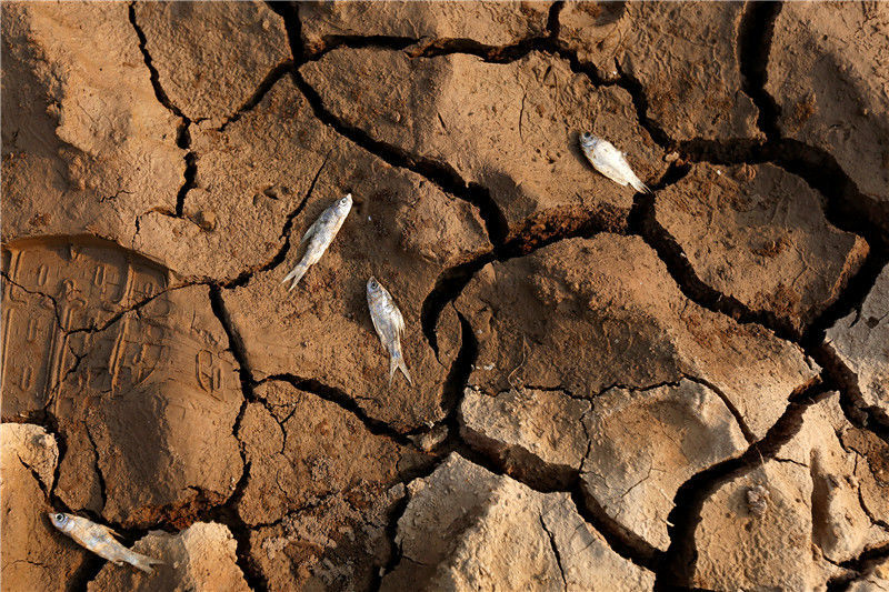 2011年9月21日,江西鄱陽湖,一條沒來及逃離的魚干死在河床上。